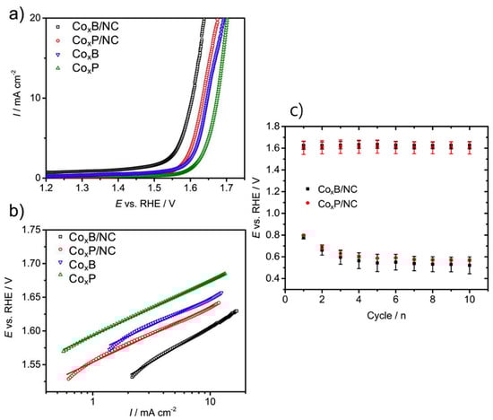 (a) LSVs for the OER on CoxB/NC, CoxP/NC, CoxB, and CoxP (1600 rpm, O2-saturated 0.1 M KOH, 5 mV s−1), (b) their corresponding Tafel plots, and (c) alternating pulse chronopotentiometry for bifunctional stability test. Each cycle consists of 15 min OER at 10 mA cm−2 and 15 min ORR at −1 mA cm−2 (1600 rpm, O2-saturated 0.1 M KOH). Reprinted with permission from Reference [15]. Copyright 2019 Elsevier.