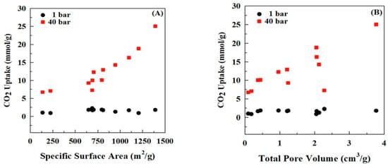 (A) Effect of specific surface area and (B) pore volume on CO2 adsorption at 1 and 40 bar. Reprinted with permission from Reference [46]. Copyright 2023 Elsevier.