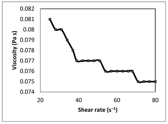 The viscosity of the final polymeric solution was evaluated to assess its flow behavior. Figure 1 illustrates a decrease in viscosity from approximately 0.081 Pa·s to 0.075 Pa·s as the shear rate increased from 30 to 75 s−1, indicative of pseudoplastic (shear-thinning) behavior in the CAS/STA/GLY/PVA/BENT solution. This trend is attributed to an increase in molecular kinetic energy [58] and the alignment of polymer chains [59]. Therefore, there is a reduction in resistance as entangled molecules begin to detangle and orient in the direction of flow [60,61]. The average viscosity, measured at ~0.077 Pa·s, exceeds values typically observed for pure PVA solutions at comparable concentrations (5–10 wt%), which range from ~0.005 to 0.015 Pa·s [62]. This increase is likely due to the presence of casein and starch, which promote molecular entanglement and form compatible interactions via hydrogen bonding [63].