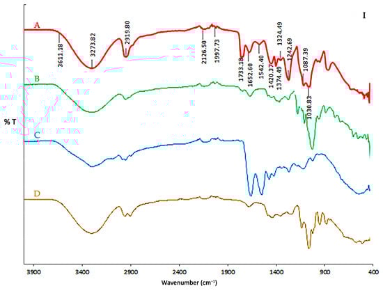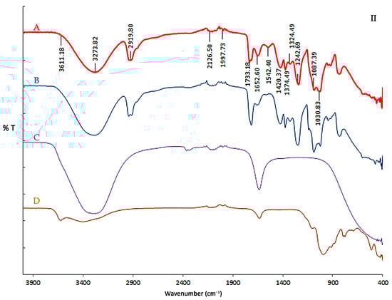 FTIR spectra of individual components and the final biodegradable film. (I) Spectra of (A) final film (CAS/STA/GLY/PVA/BENT), (B) modified starch (STA), (C) calcium caseinate (CAS), and (D) glycerol (GLY). (II) Spectra of (A) final film, (B) polyvinyl alcohol (PVA), (C) sodium hydroxide (NaOH), and (D) bentonite (BENT).