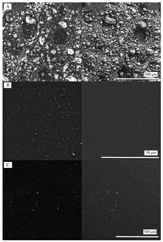 Scanning electron microscopy (SEM) micrographs of (A) pure bentonite, (B) the CAS/STA/GLY/PVA film without clay, and (C) the nanocomposite CAS/STA/GLY/PVA/BENT film. BSE (left) and SE (right) images highlight compositional and surface morphology differences across samples.