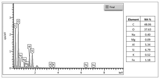 Furthermore, Figure 4 presents the EDS analysis of the nanostructured CAS/STA/GLY/PVA/BENT film, revealing its elemental composition. Dominant peaks corresponding to carbon (48.06 wt%) and oxygen (37.63 wt%) are consistent with the organic biopolymer matrix composed of casein, starch, glycerol, and PVA. Notably, the presence of silicon (6.79 wt%), aluminum (5.34 wt%), and iron (1.18 wt%) confirms the successful incorporation of bentonite, despite its low content (4 wt%). These elements are characteristic of clay minerals, which are primarily composed of alumina, silica, and various oxides [80,81]. The detection of such peaks at low concentrations suggests that bentonite was dispersed throughout the polymer network, demonstrating the effective integration of clay into the film’s composition [82].