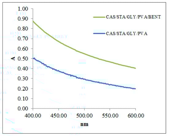 UV–Vis absorbance spectra of biopolymer films with (CAS/STA/GLY/PVA/BENT) and without bentonite (CAS/STA/GLY/PVA) across the 400–600 nm range.
