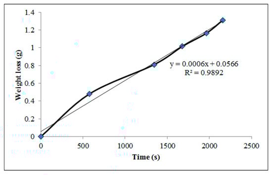 Weight loss over time used to determine the water vapor transmission rate of the CAS/STA/GLY/PVA/BENT film.