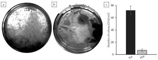 Microbiological evaluation of CAS/STA/GLY/PVA/BENT film after 48 h: (a) total aerobic bacterial count on TSA medium. (b) Mold and yeast growth on PDA medium with visible localized contamination. (c) Quantification of colony-forming units (CFU/cm2) based on plate counts.