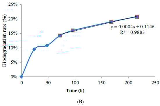 As shown in Figure 8B, the CAS/STA/GLY/PVA/BENT film exhibited a steady increase in weight loss. Based on the extrapolation of the degradation curve, complete biodegradation is estimated to occur around 13 weeks (≈2213.5 h). Although this timeline exceeds those reported for simpler casein–starch systems, the findings confirm the biodegradability of the composite, even with the inclusion of poly (vinyl alcohol) (PVA) and bentonite. The slightly delayed degradation may be attributed to increased matrix cohesion resulting from protein–PVA interactions and partial crosslinking, which can reduce water diffusion and microbial access to the polymer chains [50,104]. Moreover, nanoclays like bentonite—while beneficial for mechanical and barrier properties—can reduce biodegradation rates by impeding structural breakdown [83,105]. Overall, these experiments confirm the film’s potential for controlled biodegradation, a characteristic that aligns well with the sustainability goals of modern food packaging. This eventual environmental breakdown of such materials contributes significantly to the design of innovative biopolymer systems.