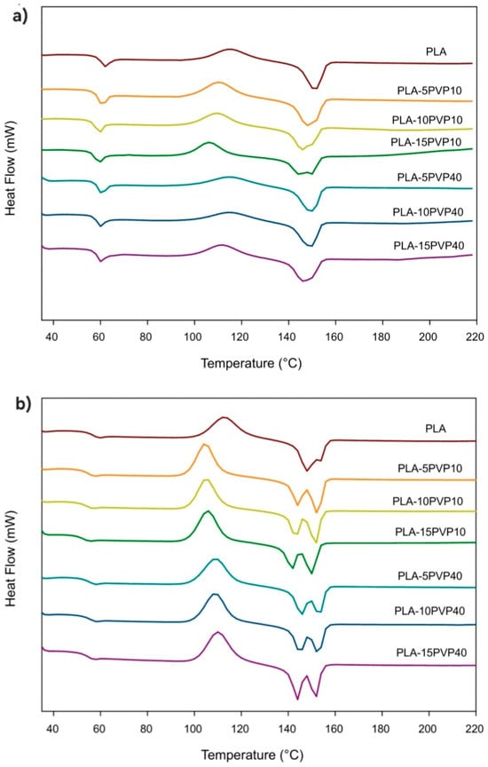 PLA exhibits a glass transition at 60 °C, cold crystallization at 115 °C, and melting at 52 °C, in accordance with reports in the literature (Table 1 and Figure 4) [20]. However, when PVP is incorporated, a plasticizing effect is observed, evidenced by a slight decrease in Tg, Tcc, and Tm. This effect becomes statistically significant at high PVP concentrations for PVP10 due to its lower molar mass, which accentuates its plasticizing effect (Table 1). Furthermore, the incorporation of PVP induced the formation of crystals with varying degrees of order, as evidenced by the presence of two well-defined melting peaks for PVP10 and at high PVP40 concentrations. This was clearly observed in all cases during the second heating, where the thermal history of the polymer blend was erased (Figure 4b). PVP produced the formation of two types of crystals with different lamellar thicknesses, with thinner crystals melting at a lower temperature, while thicker crystals melted at a higher temperature. The effect of a lower molar mass of PVP was revealed by a shift in Tcc to lower values in PLA–PVP10 blends at all concentrations.