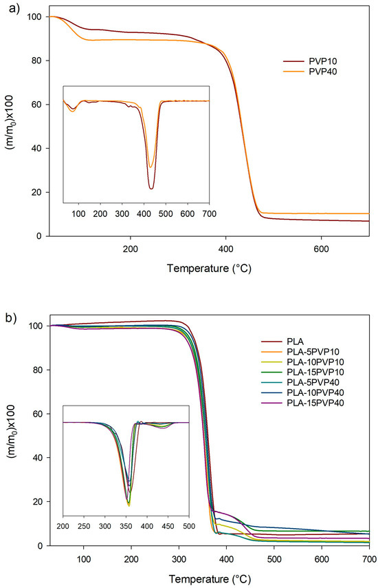TG and DTG curves of (a) PVP and (b) films of PLA and PLA–PVP blends. Inserts corresponds to DTG curves being Y axis: d(m/mo)/dT.