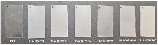 Regarding opacity, it was observed that opacity increased with the addition and increasing concentration of PVP in the PLA–PVP blend films, which tended toward greater crystallinity compared to the PLA film. However, there was no statistically clear trend with PVP molar mass and composition in the concentration range studied.