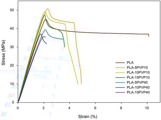 Stress vs. strain curves of the PLA and PLA–PVP films.