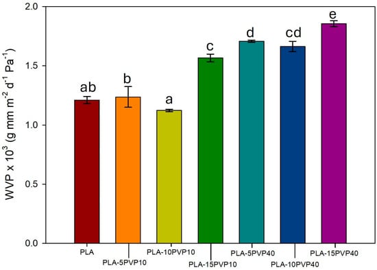 Water vapor permeability coefficient of PLA and PLA–PVP films. Significant statistical differences for a parameter among samples are indicated by different superscript letters (a, b, c, d, e), as determined by the ANOVA analysis with a significance level of p < 0.05.