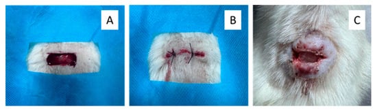 Macroscopic appearances of full-thickness skin defects modelling in rats: (A) wound formation, (B) introduction of a gauze swab with bacterial suspension into the deep layer of the skin, and (C) the appearance of a purulent wound after 3 days.