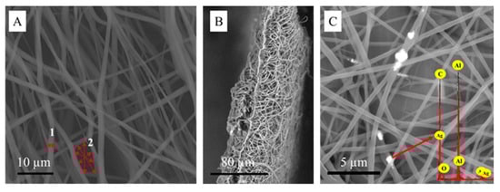 Membrane samples, each 0.5 cm2, were observed using scanning electron microscopy (SEM) (Phenom ProX, Phenom-World BV, Eindhoven, The Netherlands), which was equipped with an energy-dispersive X-ray spectrometer (EDX) to prove the morphological and chemical features. The average fiber diameter and porous area fraction were evaluated with the Fiji software (ImageJ version 1.51f; Java version 1.8.0_102) [].
