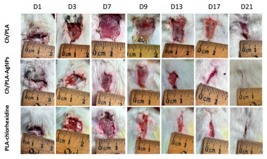 Wound healing was quantitatively assessed by measuring the wound area, with closure and recovery evaluated based on the type of treatment applied (Figure 3). On day 1, the skin defects exhibited typical characteristics of purulent wounds. Initial signs of cleansing from pathological detritus were observed between days 5 and 6 in the groups treated with PLA-chlorhexidine and Ch/PLA membranes modified with AgNPs, whereas this process began later, on day 8, in animals treated with Ch/PLA membranes without silver nanoparticles.