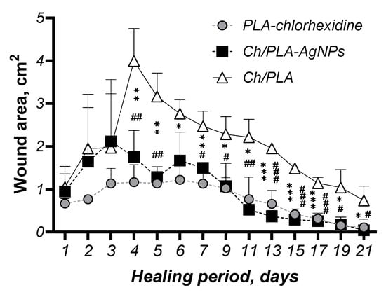 Wound size dynamics in a rat skin defect model after various treatments (n = 18). Statistical significance is indicated as follows: * p < 0.05, ** p < 0.01, *** p < 0.001 represent differences between Ch/PLA and PLA-chlorhexidine membranes; # p < 0.05, ## p < 0.01, ### p < 0.001 represent differences between Ch/PLA-AgNPs and Ch/PLA membranes.