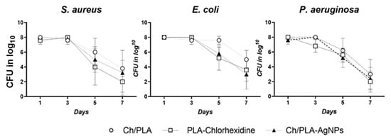 Significant differences between the groups emerged on days 5 and 7. For E. coli and S. aureus, the bacterial counts were reduced to 5 log CFU/mL and 4 log CFU/mL, respectively, in the CH/PLA-AgNP-treated samples. Similarly, P. aeruginosa counts were reduced to 5 log CFU/mL and 4 log CFU/mL. Notably, the elimination of E. coli by these time points was comparable between the AgNP-loaded membranes and the control sample containing chlorhexidine, both achieving reductions to 5 log CFU/mL and 4 log CFU/mL, respectively.