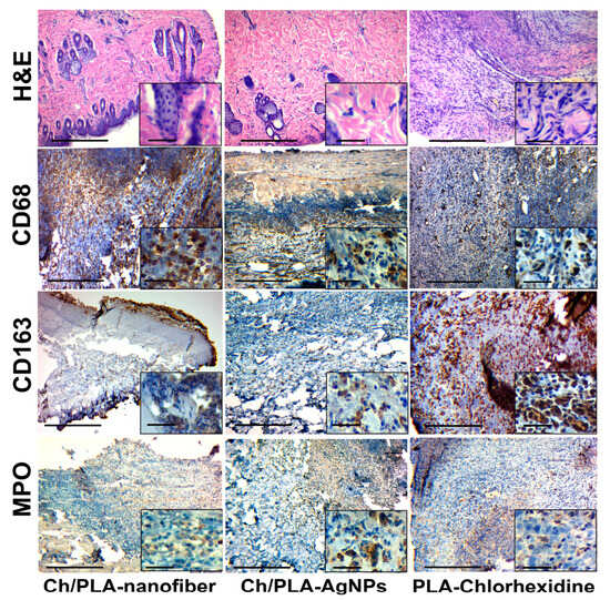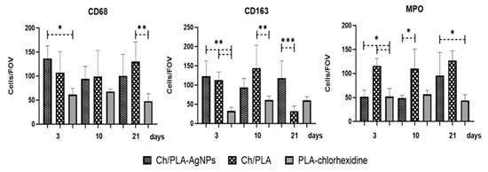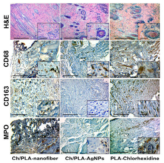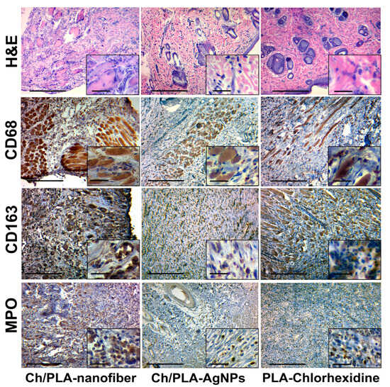 The CD163 marker also has cytoplasmic staining and is used to identify macrophages of the anti-inflammatory M2 phenotype. This phenotype has an immunosuppressive and proliferative effect and is a permanent element of the tumor microenvironment []. It is expected that the number of M2 phenotype macrophages will increase with the strengthening of reparative processes and a decrease in the intensity (suppression) of inflammation []. The immunohistochemical study of CD68- and CD163-positive cell expression has limitations and caveats. The main problem is the positive overlapping by these markers of some cell populations, such as fibroblasts, endotheliocytes, and pericytes []. Marker MPO, or myeloperoxidase, is the main enzyme of neutrophils and is used for their immunohistochemical identification []. A large number of neutrophils is a direct sign of acute purulent inflammation. Therefore, the presence of even a small number of neutrophils in the inflammatory infiltrate is a sign of the activity of the inflammatory process. The number of CD68-positive cells in the group treated with Ch/PLA-AgNPs dressing material was high at the beginning of the experiment and subsequently decreased to moderate values. The dynamics of CD163-positive cells in the tissues of the purulent wound showed the following trend: we observed a relatively large number of M2 macrophages, followed by their moderate decrease until the end of the experiment. Interestingly, the number of neutrophils (MPO-positive cells) in the Ch/PLA-AgNPs group increased in the wound towards the end of the experimental study (Figure 9).