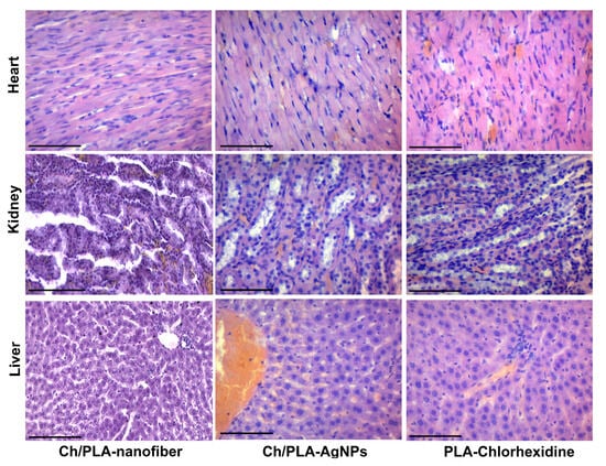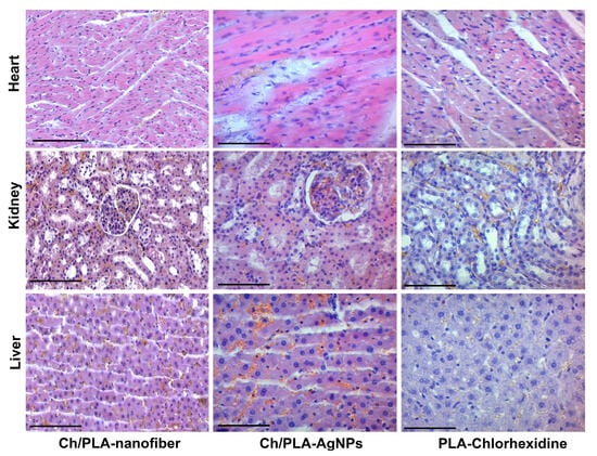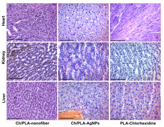 We performed a histological analysis of the experimental animals’ internal organs to evaluate the effect of using a dressing material based on polylactic acid polymer and the addition of components such as chitosan nanofibers, silver nanoparticles, and chlorhexidine.
