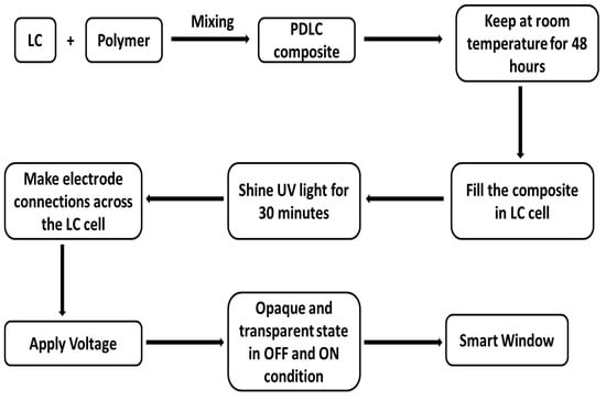 The liquid crystal–polymer mixture in a 60:40 ratio was filled into the liquid crystal cell using capillary action. The cell looks transparent at this stage, and after filling the PDLC mixture inside the cell, ultraviolet light of 365 nm and 6 W power was shined onto the cell for 15 min. This UV exposure polymerizes the photopolymer, and droplets of LC molecules are created within the matrix. The cell becomes opaque at this stage after the UV exposure. Then, the electrode connection was made onto the liquid crystal cell. The copper tape and wire was used for the electrode connection. The electrical connection can be made through electrodes. Finally, 40 V voltage was applied, and the cell became transparent. The cell turned to an opaque state when the voltage was removed. Therefore, this prepared cell filled with liquid crystal and polymer behaves as a smart electrically controlled smart window, where its transparency can be tuned by applying a certain amount of voltage. A schematic diagram of the preparation of the PDLC-based smart window is demonstrated in Figure 2. The step-wise process of making the composite, filling the composite in the LC cell, the shining of UV light and application of voltage across the cell to work as a smart window are depicted.