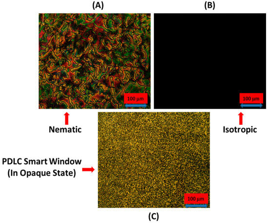 Analysis of the microscope textures of the liquid crystalline material provide insightful information about the phase, alignment and orientation of the LC molecules. Therefore, textural analysis was performed in this study, as shown in Figure 3, for the pure liquid crystal and PDLC-based smart window. The textures shown were not additionally forced by surface-stabilizing actions of the nematic. Figure 3A depicts the microscopic schlieren texture of the 5CB liquid crystal at room temperature, which represents the nematic phase of the liquid crystals. The Schlieren texture confirms that the 5CB liquid crystal shows a nematic phase at room temperature. The textures in the A and B images were taken by putting the pure liquid crystal between the glass slide and cover slip under a crossed polarizer and analyzer condition. Figure 3B shows the microscope texture of the LC by raising the temperature up to its isotropic point (35 °C). The dark black texture shows that the molecules have a random positional and orientational order and go into the isotropic state. The microscope texture of the filled LC cell (PDLC-based smart window) in the opaque state is shown in Figure 3C. The LC cell for POM textures was prepared using ITO glass plates. The plates were cleaned, and optical glue was put on the side area of the conducting region of the plates. Both plates were assembled by putting a spacer between them to make a cell, and a liquid crystal–polymer composite was sandwiched between the plates of the cell. This texture was recorded under the crossed polarizer and analyzer condition at room temperature in the absence of voltage. A high-density droplet image with bright color was observed due to the high content of liquid crystal in the polymer matrix. Voltage wise, a change in the texture of the prepared smart window was also carried out.