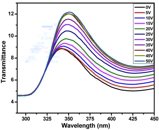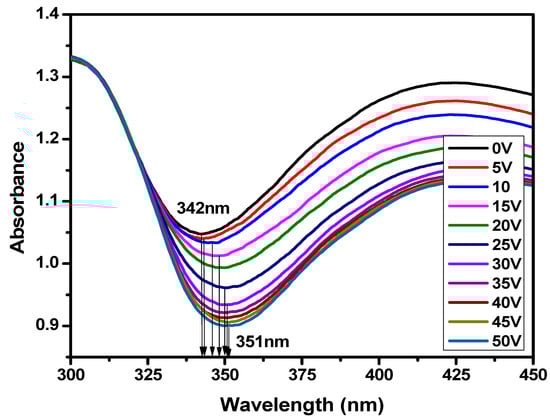 Figure 9 shows the change in UV absorbance as a function of wavelength with the variation in voltage of the PDLC-based smart window. The absorbance peak for the opaque state was found to be at 342 nm. The π–π excitation of the π-electron system of the polymer and liquid crystal composite is the primary reason for the absorption peak in the UV region. It is shown in the figure that absorbance decreases as the voltage increases. This result confirms the transmittance results, as discussed earlier. The absorbance starts decreasing when the voltage is increased from 0 V, and it becomes saturated near 40 V where the smart window completely changes its state from opaque to transparent. In the transparent state, there is a minimum absorbance of light, and in the opaque state, there is a maximum absorbance of light observed. This confirms the two states of the fabricated smart window, which can change its state by applying voltage. The absorbance peak at 0 V was found to be near the 342 nm wavelength, and the absorbance peaks starts shifting at the higher side of the wavelength when the voltage is increased. At the saturation voltage (~40 V) and above the saturation voltage, the absorbance peaks were near 351 nm. This result shows that the absorbance peaks shifted toward a higher wavelength from 342 nm in the opaque state to 351 nm in the transparent state with the application of voltage.
