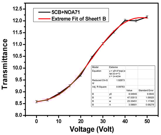 Figure 6 shows the variation in transmittance as a function of voltage at 350 nm wavelength. It can be clearly seen from this figure that the transmittance values starts increasing after 5 V and reach saturation at 40 V. These data were also fitted using graphical representation software, and the fitted curve can be seen in the red line. At 0 V, the prepared smart window based on the polymer-dispersed liquid crystal method shows an opaque state and transformed into a transparent state near 40 V. At higher voltages, the refractive indices of the LC and polymer match, light scattering reduces, and light passes throughout the PDLC; hence, it becomes transparent in nature.