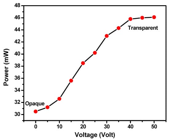The power of the laser beam passing through the PDLC system-based smart window in the opaque and transparent state was also investigated. Figure 10 depicts the change in the power of the laser beam with the variation in voltage at room temperature. The power of light is found to be minimum in the opaque state (at 0 V) and starts increasing when the voltage is increased, and then it becomes saturated when the smart window comes in the transparent state near 40 V. This trend in the power change indicates that the opaque state of the smart window is blocking some of the laser light and allows the light to completely pass through it in the transparent condition. Therefore, this result confirms that the prepared smart windows can be used as a light shutter, which may also be applicable in aerospace technology.