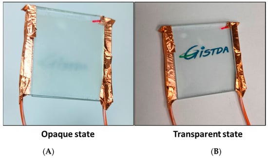 The final prepared PDLC smart window in the opaque state and ON transparent state is shown in Figure 11. The opaque and transparent state was observed in the absence and presence of voltage. The prepared PDLC works as a smart window where its transparency can be tuned by applying a certain amount of voltage. It can be seen from this figure that when it is in the OFF condition without an electric field, then it is in the opaque state, and when the electricity is applied, then it becomes transparent. In the OFF condition, we cannot see the letters “GISTDA” clearly by eye because this smart window blocks the light from passing through it. However, when 40 V voltage is applied, then it becomes transparent, light passes through it, and the letters “GISTDA” can be clearly seen. Therefore, it can be said that the prepared PDLC liquid crystal cell works as an electrically controlled smart window. This is an energy-efficient smart window and can be operated at lower voltage when compared to the general PDLC adaptive glasses, which operate at much higher voltages.