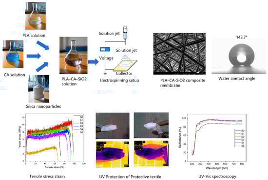Biopolymeric polylactic acid and cellulose acetate composite membranes, reinforced with silica nanoparticles at 0.5, 1.5, 3, 5, and 7% (w/w) concentrations, were successfully produced and analyzed for multifunctional protective textiles applications. The PLA–CA composites demonstrated good mechanical, thermal, hydrophobic and hydrostatic pressure resistance. Furthermore, these properties were enhanced by incorporating silica nanoparticles into PLA–CA composite membranes. All composite membranes exhibited good morphological characteristics. As the concentration of silica increased, the fiber diameters also increased, reaching a maximum of 784 nm in the S3 composite membrane. Beyond this concentration, further increases in silica content led to a reduction in fibers diameters. EDX and elemental mapping confirmed the presence of silica nanoparticles in composite membranes. The thermal properties of the composite improved the concentration of silica nanoparticles by up to 1.5%; beyond that, thermal stability decreased. XRD results confirmed a reduction in crystallinity with increasing silica concentrations. FT–IR analysis confirmed the presence of functional groups and chemical bonding in PLA–CA–SiO2 composite membranes. Composite membranes have shown good UV–A, UV–B and visible radiation blocking efficiency. Additionally, radiation blockage increased with higher concentrations of silica nanoparticles. Thermal infrared imaging showed effectiveness as protective textiles under direct sun radiation. The concentration of silica also affects wettability and resistance to hydrostatic pressure. The S3 composite membrane demonstrated a water contact angle of 143.7° and a hydrostatic pressure resistance of 27 kPa. The microporous structure of the composite membranes improved breathability and enhanced air and vapor transport. Tensile testing revealed that the small concentrations of silica nanoparticles enhanced the tensile strength and toughness of membranes. The S1 composite membrane demonstrated a tensile strength of 11.2 MPa, a Young’s modulus of 329 MPa, and an elongation at break of 98.5%. The developed biopolymeric composite membranes demonstrated desirable properties typical of electrospun composites and showed strong potential to replace petroleum-based polymers in various applications.