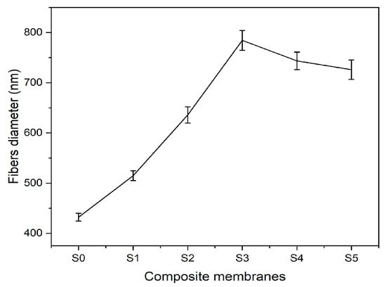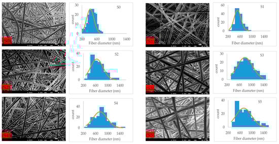 Microstructural images of fibrous composite membranes and the normal distribution of fibers diameters of electrospun biopolymer composite textiles are shown in Figure 2. SEM images represent smooth, homogeneous, continuous, and beads free fibers. The electrospun composite membrane sample with no SiO2 content (sample S0) has an average fiber diameter of 432 ± 7.8 nm with a standard error. The sample with SiO2 content 0.5% (sample S1) has an average fiber diameter of 514 ± 9.8 nm, which is around a 20% increase compared to the pure composite. Further increments in the concentration of silica nanoparticles to 1.5% (sample S2) and 3% (sample S3) produce consistent increases in the average fiber diameter rises to 635 ± 16.2 nm and 784 ± 19.8 nm, respectively, reaching a maximum increase over 70% over the original average diameter. Individual charts for each sample are shown in Figure 3. Up to this point, the average diameter of composite fibers increases consistently as silica nanoparticles concentration increases, where such nanoparticles act as nucleation sites for the crystallization in PLA–CA–SiO2 composite and enhance the interfacial adhesion between the PLA–CA matrix composite and the fibers. However, a further increase in the silica nanoparticles concentration in the composite solution slightly decreases the average fiber diameter. The composite samples S4 and S5 have average fiber diameters of 744 ± 17.4 nm and 725 ± 19.3 nm, respectively. Such a benign reduction in average fiber diameter may be attributed to repulsive forces during the electrospinning process among silica nanoparticles due to an increase in conductivity, which may decrease the entanglement of composite polymer chains.
