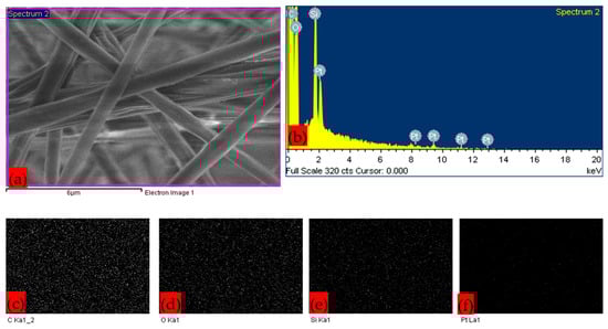 Figure 4 represents the EDX and elemental mapping images of the composite membrane sample S3, which has the highest fiber average diameter. The images confirm the presence of silica nanoparticles. Carbon and oxygen are the building blocks of polymer composite. The platinum element was coated to enhance the conductivity of the membrane sample for processing in SEM. Overall, PLA–CA–SiO2 composite membrane samples S1–S5 exhibited comparable morphological nanofibrous architecture and nanoparticle characterization.