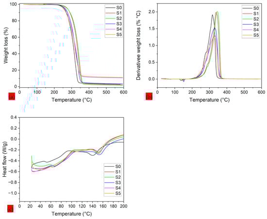 A comprehensive thermal analysis of PLA–CA–SiO2 electrospun composite membranes is shown in Figure 5. Thermal degradation and threshold temperatures are important parameters used to optimize composite systems [39]. A TGA thermogram is used to analyze onset temperature and the temperature at different weight loss percentages of composite. The differential thermogravimetry (DTG) curves are used to measure the maximum peak temperature of weight loss curves, and DSC curves are utilized to measure glass transition () and melting temperatures of biopolymer composite mats. TGA thermograms represent a single degradation step, and the main weight loss of the composite polymer was observed between 250 °C and 350 °C. Up to 100 °C, no thermal dehydration was observed, which confirmed the hydrophobic nature of protective membranes. S0 composite membrane demonstrated onset temperature (), 50% () weight loss, and peak maximum temperature (), , and temperatures of 298.9, 322.27, 329.65, 61.31, and 144.24 °C, respectively. Further increasing the concentration of silica nanoparticles to 1.5% (S2 Samples) results in increasing the thermal stability of composite membranes. The S2 composite membrane has shown the maximum thermal stability and demonstrated the , , , , and temperatures of 313.6, 337.1, 345.6, 59.23, and 153.5 °C, respectively. Further enhancing silica concentration to 3% to 7%, the thermal properties of composite membranes decrease. The thermal properties of composite membranes are summarized in Table 2. The thermographs of PLA–CA–SiO2 composite membranes are consistent with those reported in the literature [40]. In PLA–CA–SiO2 composite membranes, the degree of crystallinity is proportional to thermal stability. The TGA thermogram curves for S1 and S2 composite membranes are at higher temperatures, indicating higher thermal stability and the crystallinity of the membranes. Further increases in the silica concentration thermograms produce TGA curves with lower temperatures, which could be attributed to aggregations of silica nanoparticles during the electrospinning process, reducing the chain mobility which leads to decreases in thermal stability and crystallinity [41]. By increasing the concentration of silica nanoparticles, the percentage of the residue mass increases. S1 composite has a residue mass of 2.3%, while S5 membrane has a residue mass of 11.2%. As in the analysis for the average fiber diameter, the optimum value of the property is found at an intermediate range of silica concentration.