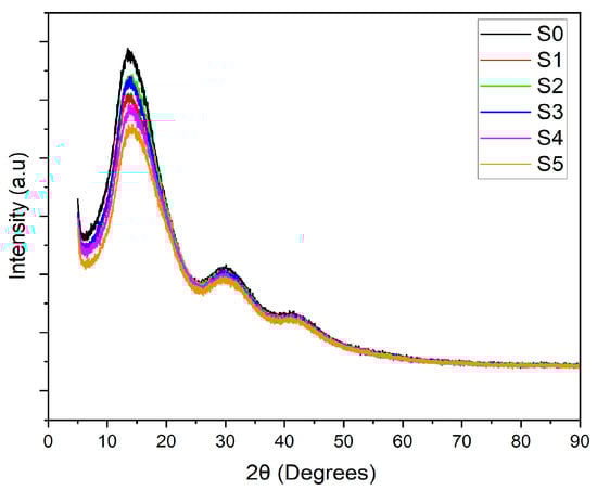 The crystallinity of the PLA–CA–SiO2 composite membranes is investigated with X-ray diffractometry curves shown in Figure 6. The PLA-CA composite membrane demonstrated a semicrystalline curve showing a peak at Bragg’s angle (2θ) of 13.8 degrees and broader peaks at Bragg’s angle of 30 and 42 degrees. By blending silica nanoparticles, the intensity of the curves decreases, as also reported in [42], all composite membranes demonstrated the peaks at the same Bragg’s angle. The intensity of XRD curves increases by increasing the concentration of silica nanoparticles from 0.5 to 3% concentration; further increases in concentration reduce the intensity of peaks. The decrease in intensity could be ascribed to the agglomeration of silica nanoparticles which reduce nucleation effect.