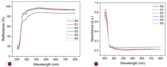 Figure 8a,b showcase the reflection and absorption spectroscopy of PLA–CA–SiO2 electrospun composite membranes and the effect of silicon dioxide nanoparticles across the UV–Vis spectrum. For Figure 8a, the protective specimen without silica nanoparticles (S0) demonstrated lowest reflectance, especially in the UV region (200–400 nm), with values increasing steeply beyond 400 nm. This minimal UV reflection can be attributed to high absorption or scattering in PLA–CA composite membranes. All silica-reinforced composites from S1 to S5 exhibit increased reflection in VU range, with effect becoming more prominent at higher concentrations of silica nanoparticles. This improvement in protective textile can be attributed to the enhanced surface roughness and scattering centers generated by silica nanoparticles, which redirect UV photons away from protective textile rather than allowing them to absorb. Approximate stabilization in reflectance is observed above 400 nm across all protective textiles, which suggests the silica effect is most prominent in the UV region due to the distribution and size of silicon dioxide nanoparticles interacting more effectively with shorter wavelengths. The protective textile manages the heat of the body by evaporating the vapors and also helps to protect the skin from burning and aging and reduce the chances of cancer [43].