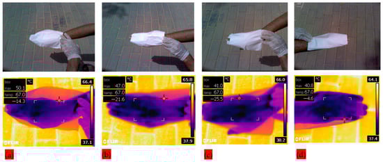 Additionally, infrared thermal images were captured to analyze the infrared blocking efficiency of PLA–CA–SiO2 composite membranes. Human skin was exposed under sunlight with protective textiles of different SiO2 concentrations in order to investigate the effect of introduction of silica nanoparticles, and temperature is measured by infrared camera in the premises of King Saud University, Riyadh, KSA. Figure 9 shows visual and infrared thermal images of the human hand covered with protective textile membranes. Cases S1–S4, represented by Figure 9a–d) in the graph, respectively. The measured temperature drops gradually as the silica content is increased from an initial value of 50.1 °C, for S1, as shown in Figure 9a, to a minimum value of 40.8 °C for S4, as shown in Figure 9d. The biopolymer developed protective textile with 5% silica resulted in a significant improvement over the one with only 0.5% silica, with a temperature reduction of more than 18% in the human hand. It is noted that there is very little difference between cases of to S3 in Figure 9c and S4 in Figure 9d. This is consistent with the result of the average fiber diameter of the two membranes as the average diameter reaches a peak for S3 and then starts to decrease slightly for S4. This result may have significance in applications for the protection of the human body from direct sunlight exposure.