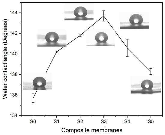 Water contact angle (WCA) observations were carried out to analyze the hydrophobic characteristics of electrospun composite textiles. Figure 10 shows WCA measurements of composite at various concentrations of silica nanoparticles. The PLA–CA composite membrane demonstrated the WCA of 135.7°. By increasing the concentration of silica nanoparticles, the WCA of composite membranes increases. The composite membranes S1, and S2 have water contact angles of 140.3° and 141.6°. S3 multifunctional membranes demonstrated a maximum WCA of 143.7°. An increase in WCA can be credited to an increase in surface roughness of composite membranes due to the presence of silica nanoparticles. These rough surfaces trap air that reduces contact area between water droplets and membrane surface. Further increases in the concentration of silica nanoparticles reduce the WCA. S4 and S5 membranes have WCA values of 140.3° and 138.3° respectively. At higher concentrations, due to the agglomeration of silica nanoparticles, WCA decreases [44,45].