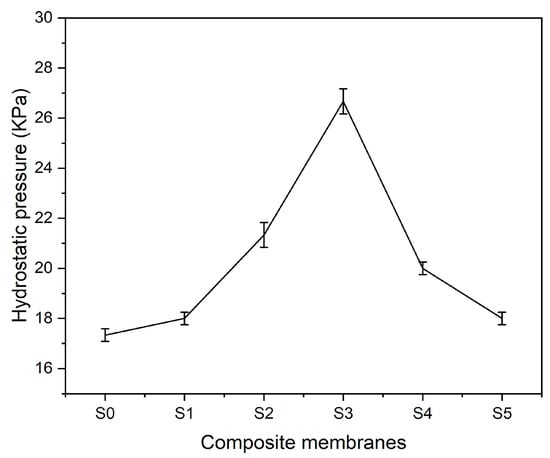 The ability to resist hydrostatic pressure further verifies the waterproofness and strength of composite membranes. Hydrostatic pressure resistance setup is manually established in the lab. Hydrostatic pressure on the multifunctional textile surface is manipulated by the suction pressure of the vacuum pump. Pressure on the gauge is noted until drops of water become visible on the bottom surface of composite membranes. Figure 11 represents the characteristics of composite textiles in terms of resisting hydrostatic pressure. PLA–CA composite membrane shows the hydrostatic pressure resistance of 17.5 kPa. By enhancing the concentration of silica nanoparticles, hydrostatic pressure resistance increases. The S3 composite membrane has shown the maximum hydrostatic pressure resistance of 27 kPa. A similar trend was observed for hydrostatic pressure resistance in the literature [40]. This further increased silica concentration and decreased hydrostatic pressure resistance. The S5 composite membrane had a hydrostatic pressure resistance of 18 kPa.