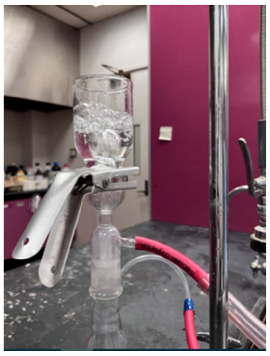The effect of silica nanoparticles on air permeability was analyzed by a manually developed breathability apparatus. The manual setup is developed as reported in [38]; the membrane is adjusted in an assembly glass flask, and water is filled on its top surface. Compressed air is passed from the bottom side; as air passes through the membrane, air bubbles come out from the water, as shown in Figure 12. All composite membranes were tested for breathability, and they demonstrated air permeability.
