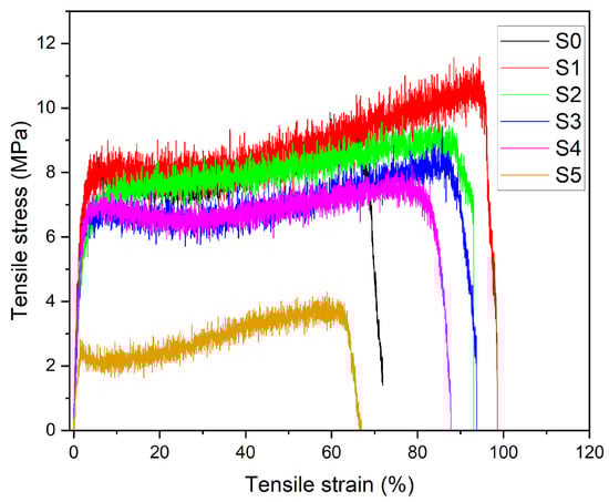 The mechanical behavior of PLA–CA–SiO2 composite membranes was evaluated by tensile testing. The tensile test can be performed on either a single electrospun nano/microfiber or on a membrane [46,47]. Most researchers prefer to analyze the mechanical properties of electrospun membranes with a universal testing machine [48,49]. The tensile test demonstrates how material behaves in response to an axially applied load. Figure 13 shows the stress–strain curves of composite membranes. The PLA–CA composite membrane has a tensile strength of 9.3 MPa, a Young’s modulus of 291 MPa, and an elongation at break of 72.9%. Initially, the addition of silica nanoparticles enhanced the mechanical properties of composite membranes. The S1 membrane has demonstrated a maximum tensile strength of 11.2 MPa, a Young’s modulus of 329 MPa, and an elongation at break of 98.5%. Further increasing silica concentrations reduces mechanical properties. S2 membrane has a tensile strength of 9.7 MPa, a Young’s modulus of 320 MPa, and an elongation at break of 94%. S5 has a tensile strength of 3.9 MPa, a Young’s modulus of 112 MPa, and an elongation at break of 66%. At lower concentrations, silica nanoparticles enhance the interfacial adhesion and nanofibers morphology of composite membranes. However, at higher concentrations of silica, nanoparticles cause aggregation, which may hinder the chain mobility and disrupt the composite nanofibers structures. All such changes together lead to the reduction in mechanical properties of composite membranes [50,51].