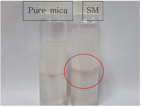 To verify the surface modification of mica, DIW and the hydrophobic substance chloroform were placed in a vial, and mica and SM were, respectively, introduced into the interface formed by the two liquids to form a Pickering emulsion [38]. The corresponding photographs are provided in Figure 1.