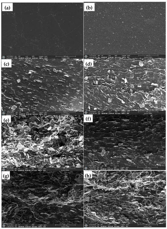 Furthermore, the degree of agglomeration among mica particles was lower in the SM-containing composites [23]. In contrast, the unmodified mica systems exhibited larger aggregates and poor filler dispersion, which likely contributed to stress concentration points and deteriorated mechanical performance, as also reflected in the reduced tensile strength, which will be discussed in mechanical studies [39]. The improved dispersion of SM fillers is consistent with the enhanced toughness and tensile modulus, especially in the CB20/SM10 sample, which exhibited the best balance of elasticity and mechanical reinforcement. The sample E9B1/SM30 (Figure 2h) showed relatively uniform filler distribution even at high SM content, unlike the unmodified mica samples, where increased surface-treated filler content led to more pronounced agglomeration. This confirms that surface treatment not only enhances filler–matrix adhesion but also suppresses the tendency for particle clustering at higher loadings.