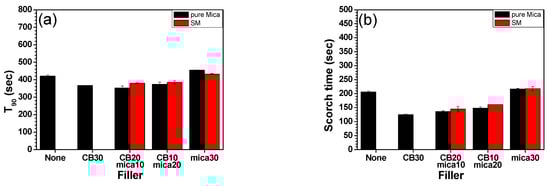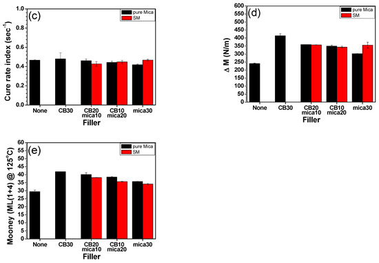 Mooney viscosity results (Figure 3e) demonstrated a gradual decline as the mica content increased, which aligns with expectations for layered, plate-like fillers. The incorporation of mica, particularly in high aspect ratio and well-dispersed form, can facilitate matrix flow by acting as a processing aid, thereby reducing internal friction during mixing [27]. This effect was consistent in both M and SM systems, indicating that the silane surface treatment did not significantly alter processability at the compounding stage.
