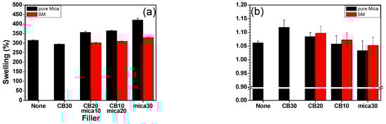 Swelling tests of EPDM/BR/CB/mica rubber composites: (a) swelling index and (b) crosslink density.