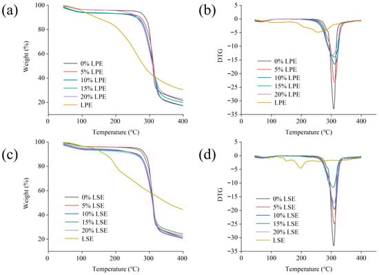 Effects of different concentrations of LPE and LSE on the TG of wheat starch: (a) TG curves of LPE; (b) DTG curves of LPE; (c) TG curves of LSE; (d) DTG curves of LSE.
