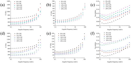 Effects of different concentrations of LPE and LSE on the rheological properties of wheat starch: (a) G’ of LPE; (b) G’’ of LPE; (c) tanδ of LPE; (d) G’ of LSE; (e) G’’ of LSE; (f) tanδ of LSE.