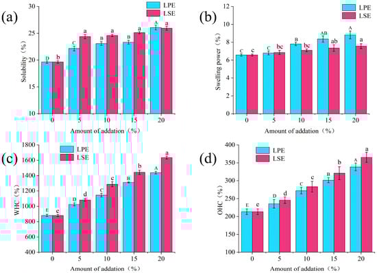 Effects of LPE and LSE on the water holding capacity, oil holding capacity, solubility and swelling power of wheat starch: (a) solubility; (b) swelling power; (c) WHC; (d) OHC.