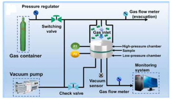 Considering the thermal limitations of polymer coatings, the high-temperature gaseous permeation test was discarded, leaving the membrane permeation cell as the most suitable means of evaluation. The coated samples were placed in an airtight chamber, and a pressure-regulated hydrogen tank supplied hydrogen to the inlet at a constant pressure of 35 bar, while the outlet was left at atmospheric pressure. Flow rates were then recorded every 10 min for a duration of 1 h for each sample. Figure 1 presents a schematic diagram of the membrane permeation chamber.