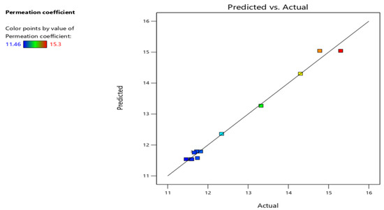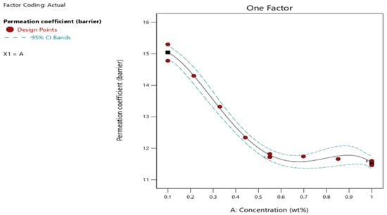 The collected and computed results were then fed back to the RSM statistical model, with the aim of evaluating the results in terms of the significance of the concentration for the permeation coefficient and the proposed model fit. As shown in Table 5, based on the results obtained, the quartic i-optimal model was the best-fitting model for the given data, with the highest combination of predicted and adjusted coefficients of determination, yielding an adjusted R2 value of 0.987 and a predicted R2 of 0.9661. The model also displayed higher statistical significance and low lack-of-fit values (Equation (5)).