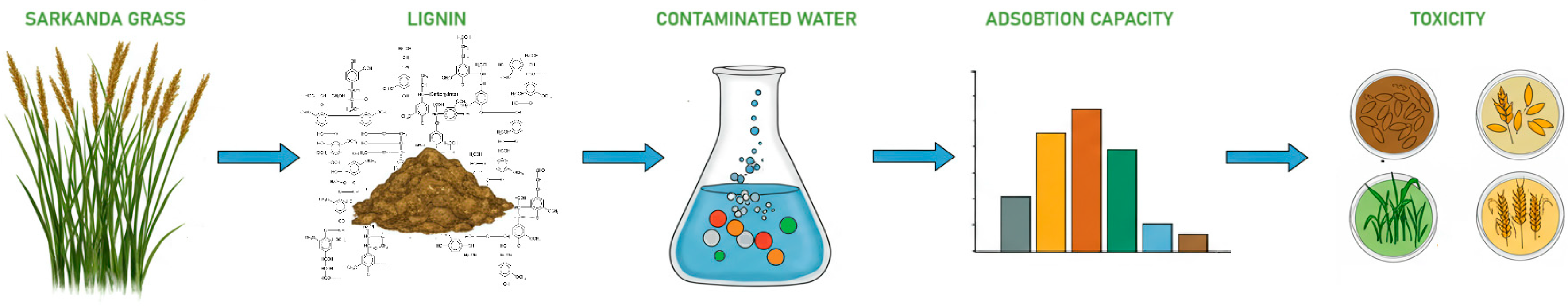 Sarkanda grass (Tripidium bengalense), an abundant lignocellulosic biomass residue, presents an opportunity for valorization within a circular bioeconomy framework [16,17]. The lignin derived from this source, utilized in its unmodified state, has been the subject of a systematic series of investigations by our group, exploring its capacity to remediate a wide spectrum of contaminants: metalloid arsenic (As) and metals such as cadmium (Cd), chromium (Cr), cobalt (Co), copper (Cu), iron (Fe), nickel (Ni), lead (Pb), and zinc (Zn) [18,19,20,21,22,23,24,25,26,27,28]. An overview of the experimental methodology is illustrated in Figure 1.