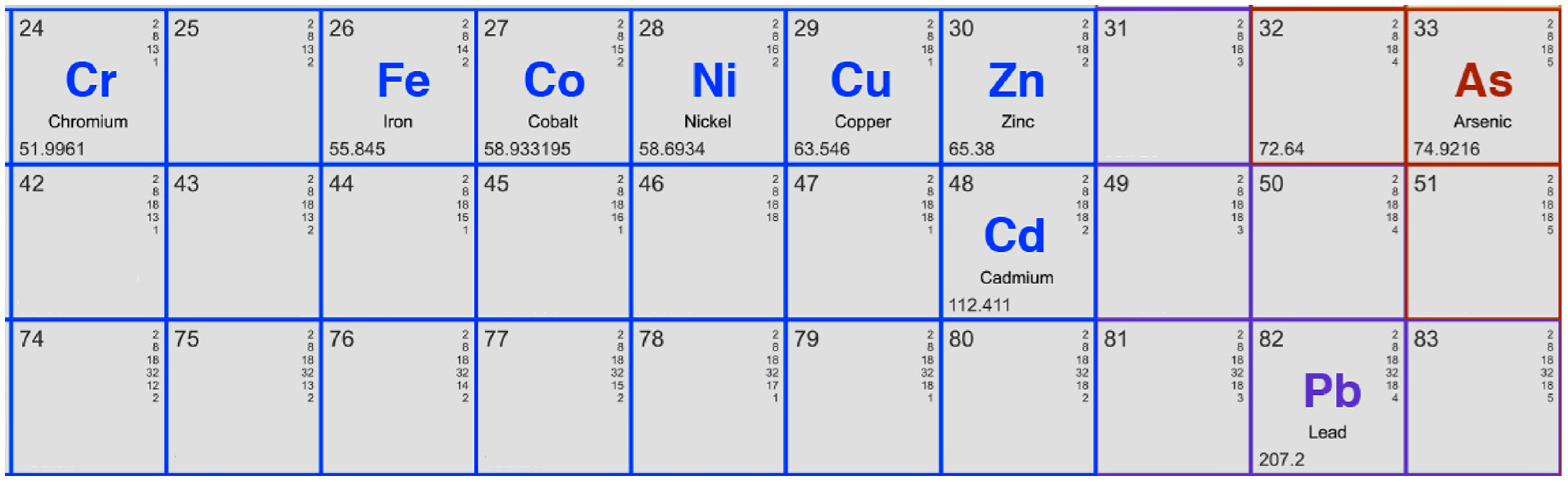 To provide a clear visual framework for the diverse chemistry of the pollutants under investigation, Figure 2 illustrates their positions within the periodic table. This schematic is intended to offer the reader an immediate appreciation for the scope of our comparative analysis, which spans first-row transition metals (Cr, Fe, Co, Ni, Cu, Zn), heavier post-transition metals (Cd, Pb), and a metalloid (As). This visual grouping helps to contextualize the subsequent discussions on how periodic trends, such as ionic radius and electronegativity, correlate with the observed adsorption affinities on the same lignin substrate. The ability to directly compare the behavior of adjacent elements like Co, Ni, and Cu, for example, is a key strength of this study, and Figure 2 serves as a constant reference for these elemental relationships.